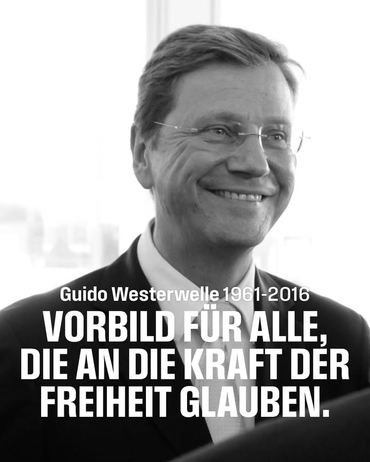 Zehn Jahre nach seinem Tod bleibt Guido Westerwelle als eine der prägenden und wichtigsten Stimmen des deutschen Liberalismus für uns unvergessen. Über viele Jahre hat er die deutsche Politik geprägt – als FDP-Generalsekretär, Partei- und Fraktionsvorsitzender sowie Bundesaußenminister. Auch in schwierigen Zeiten war er mit voller Überzeugung Freier Demokrat. Guido Westerwelle war ein engagierter Verfechter der Freiheit, der wie kaum ein anderer für eine offene und tolerante Gesellschaft eintrat. Wir ehren in, indem wir seinen Einsatz für die Freiheit mit derselben Entschlossenheit weiterführen, die sein Leben geprägt hat. Er bleibt ein Vorbild für alle, die an die Kraft der Freiheit glauben.